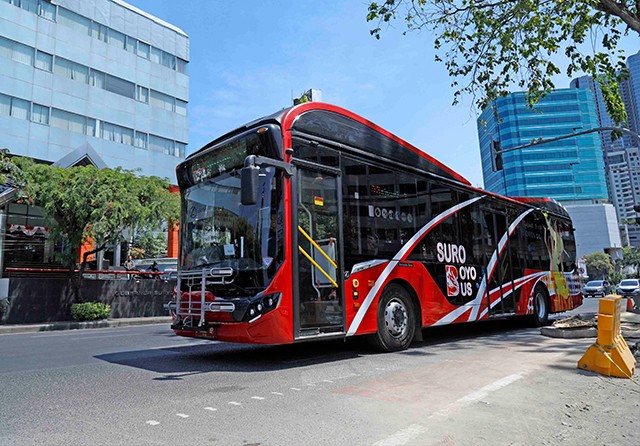 MASIH POLEMIK: Armada Suroboyo Bus ketika berada di Jalan Gubernur Suryo. Pengelolaannya masih menuai kontroversi. (Puguh Sujiatmiko/Jawa Pos)