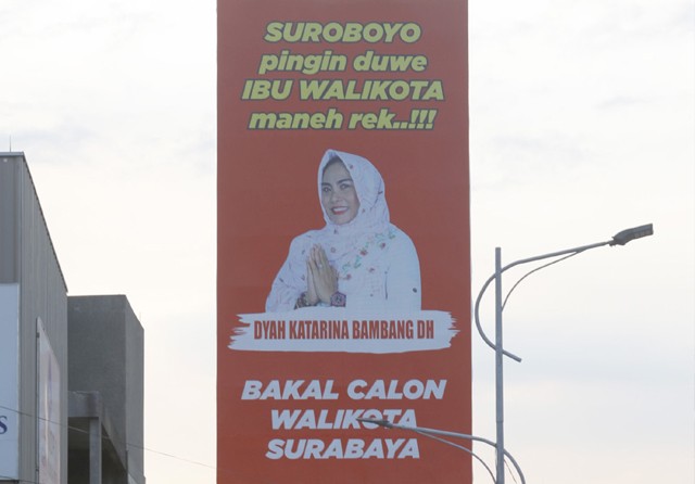 JawaPos.com - ’’SUROBOYO pingin duwe IBU WALI KOTA maneh rek,,!!”. Tulisan itu tercantum pada baliho milik Dyah Katarina. Istri mantan Wali Kota Surabaya Bambang D.H. itu menyatakan secara serius ingin maju pilwali sebagai penerus wali kota perempuan pertama di Surabaya, Tri Rismaharini.