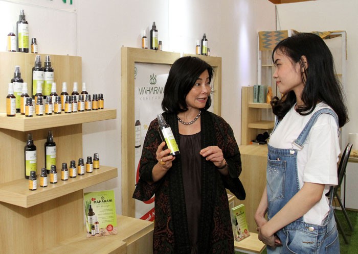 TEMURUN: Ursula Maharani (kiri) menjelaskan ramuan tradisional berbahan dasar sereh di Galaxy Mall, Jalan Ir. Dr. Soekarno, Surabaya, Minggu (24/11/2019). Produk-produk kesehatan tersebut merupakan warisan turun-menurun dari orangtuanya. Robertus Risky/ J