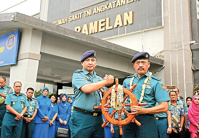 RESMI: Laksamana Pertama TNI dr Ahmad Samsulhadi (kanan) menyerahkan kemudi kapal kepada penggantinya, Kolonel Laut (K) dr Radito SpTHT-KL. (Haryanto Teng/Jawa Pos)