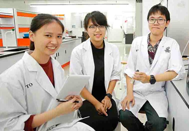 PENELITI MUDA: Dari kiri, Natasya Teonata, Vania Aurellia Wijaya, dan Christianus Jodi Yonathan di laboratorium Food Technology Universitas Ciputra kemarin. (Guslan Gumilang/Jawa Pos)