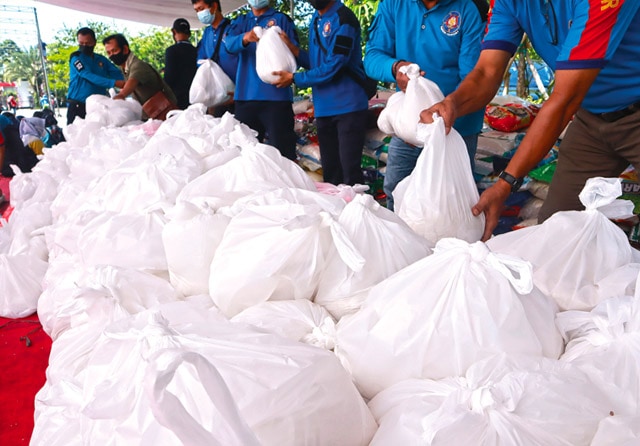 BANTUAN PERMAKANAN: Petugas mengemas paket sembako di halaman Taman Surya, Surabaya. (Dite Surendra/Jawa Pos)