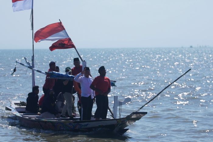 JawaPos.com–Upacara di tengah lapangan sudah hal biasa. Bagaimana jika upacara bendera di pesisir pantai dan di atas perahu. Puluhan nelayan siaga di Pesisir Pantai Kenjeran Surabaya.