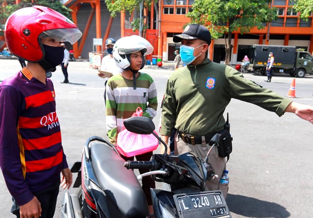 RAZIA: Petugas satpol PP mencegat pengendara sepeda motor yang tidak mengenakan masker. (Robertus Risky/Jawa Pos)