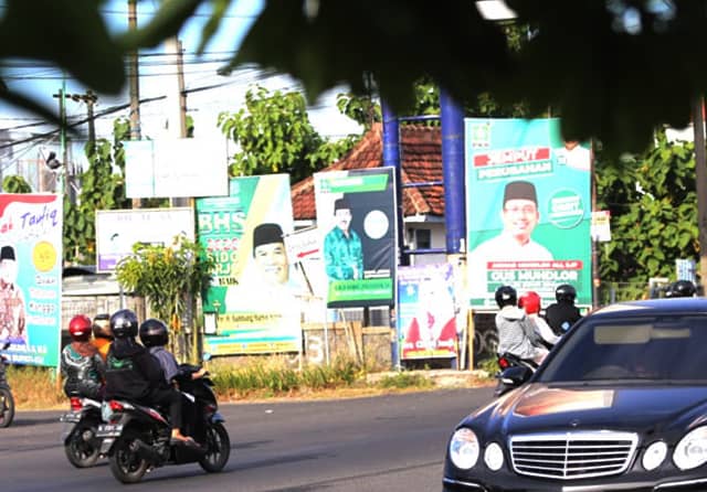 KANDIDAT: Baliho para bakal calon bupati Sidoarjo terpampang di wilayah Pagerwojo kemarin. Di antaranya, ada Bambang Haryo Soekartono dan Nur Ahmad Syaifuddin. (Boy Slamet/Jawa Pos)