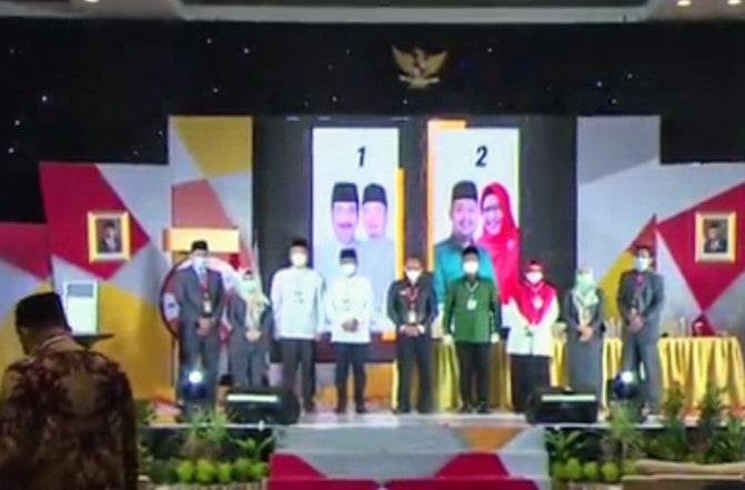 JawaPos.com–Pasangan calon (paslon) Qosim-Alif (QA) yang didukung dua partai politik yakni PKB dengan raihan 13 kursi dan Gerindra dengan 8 kursi, mendapat nomor urut 1 hasil rapat pleno terbuka pengundian nomor urut yang dilakukan Komisi Pemilihan Umum (KPU) Gresik, Kamis (24/9) malam. Sedangkan nomor urut 2 pasangan Fandi Akhmad Yani-Aminatun Habibah (Niat) yang didukung enam parpol, yakni Golkar dengan raihan 8 kursi, PDIP 6 kursi, Nasdem 5 kursi, Demokrat 4 kursi, PAN 3 kursi, dan PPP dengan 3 kursi. Pilkada Gresik 2020 hanya diikuti dua paslon.