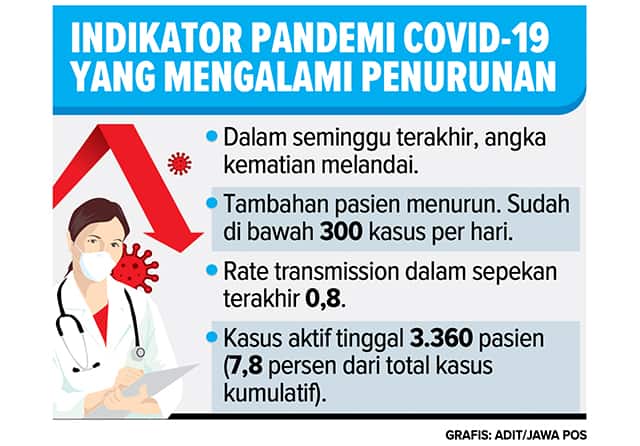 Saat ini pasien Covid-19 aktif (yang dirawat) tinggal 3.360 orang. Atau, hanya 7,8 persen dari total kasus di Jatim. Meski demikian, Khofifah menegaskan bahwa penurunan indikator-indikator tersebut tidak berarti situasi pandemi sudah aman. Satgas Covid-19 Jatim dan kabupaten/kota terus berupaya meningkatkan kedisiplinan di masyarakat. ”Utamanya penerapan standar protokol kesehatan,” katanya.