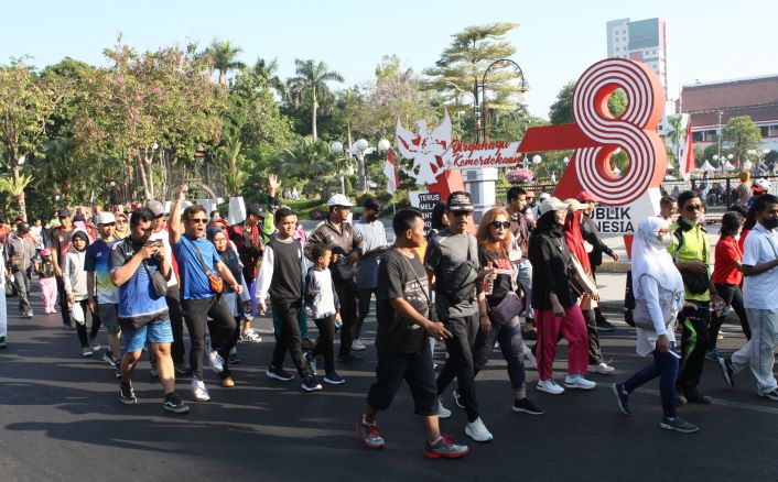 Berlokasi di halaman Balai Kota Surabaya dan Taman Surya, ribuan warga terlihat berkumpul sejak pagi untuk mengikuti jalan sehat. Agenda yang digelar UT Surabaya itu bekerja sama dengan Pemerintah Kota (Pemkot) Surabaya.