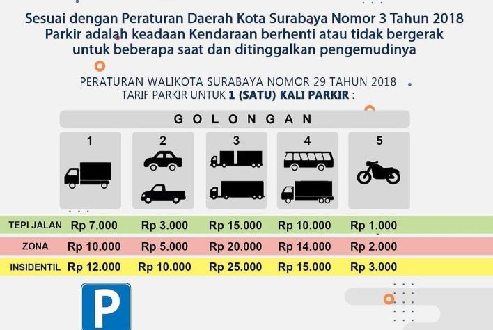 Di dalam Perwali Surabaya 29/2018 itu, kendaraan dibagi menjadi lima kelompok atau golongan. Pertama, parkir tepi jalan Rp 7.000, zona parkir Rp 10.000, dan insidentil Rp 12.000. Kedua, parkir tepi jalan Rp 3.000, zona parkir Rp 5.000, dan insidentil Rp 10.000.