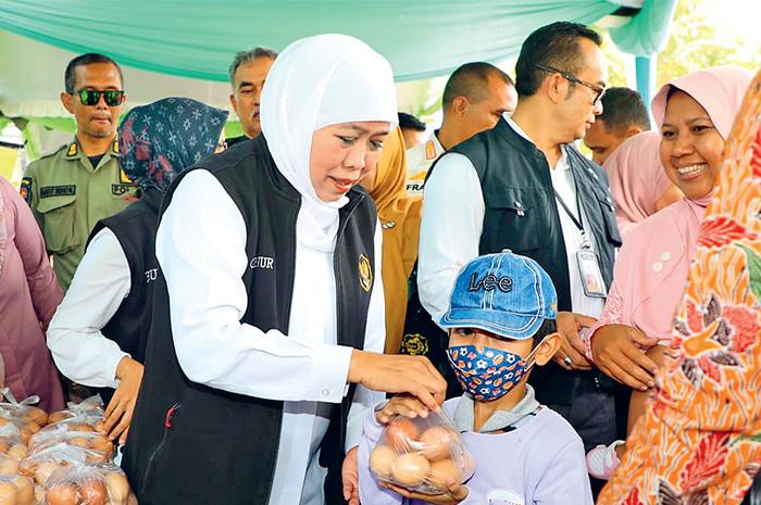 BERBAGI: Gubernur Khofifah Indar Parawansa membagikan telur gratis kepada warga di sela-sela pasar bahan pokok murah di Pendopo Kabupaten Blitar kemarin (11/10).