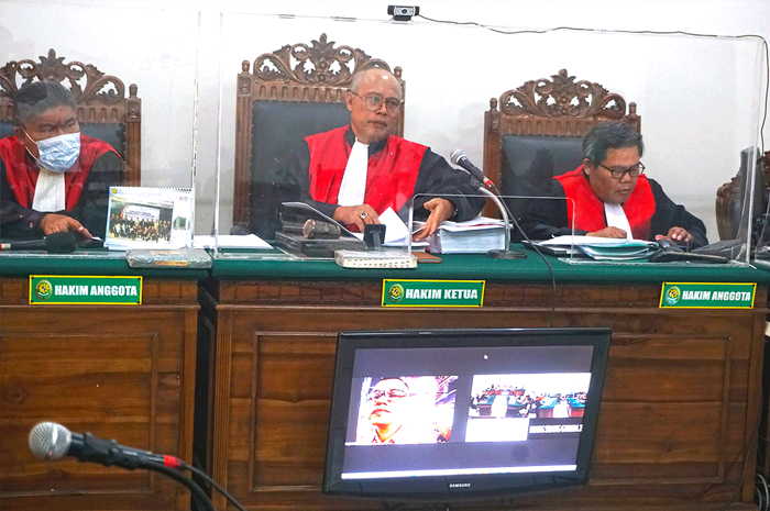 MEMBELA DIRI: Indro Prajitno disidang secara telekonferensi di PN Surabaya, Rabu (11/10).