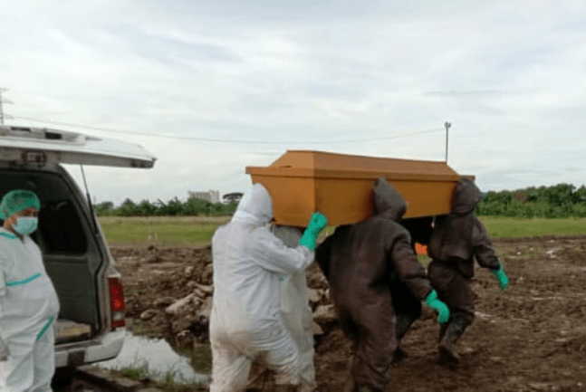 Petugas TPU Keputih membawa peti yang akan dimakamkan. Yusuf for JawaPos
