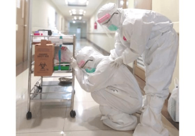 Tenaga kesehatan di Rumah Sakit Universitas Airlangga Surabaya saling menyemangati. Dok. JawaPos