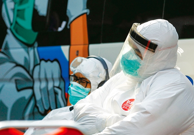 GARDA TERDEPAN: Sejumlah tenaga kesehatan beristirahat sejenak di sela melaksanakan tugas uji swab massal. (Dipta Wahyu/Jawa Pos)
