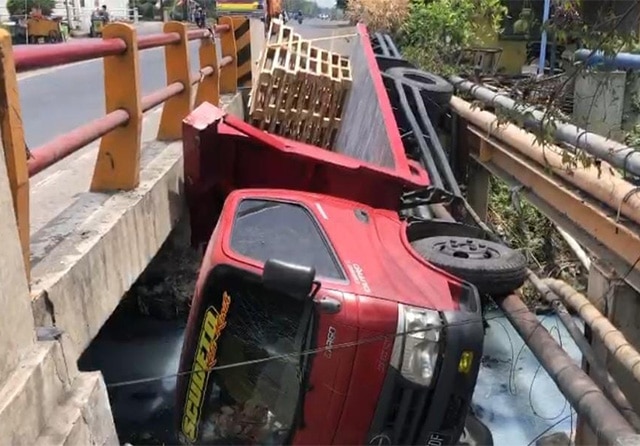 Peristiwa yang terjadi pada pukul 02.00 WIB, Minggu (5/9), itu tidak memakan korban. Meskipun, badan truk mengalami rusak parah akibat tersangkut pipa jembatan. Muatannya yang berupa bata ringan pun jatuh berserakan.