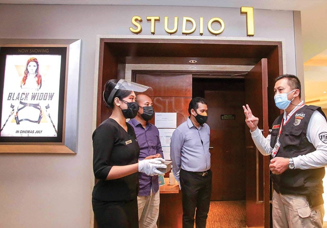 MEMASTIKAN: Satgas melakukan pengecekan akhir operasional bioskop, Kamis (16/9). (Alfian Rizal/Jawa Pos)