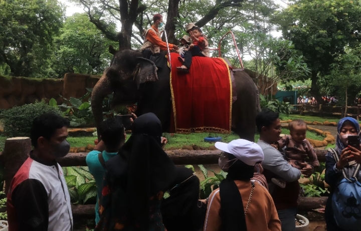 Atraksi naik gajah merupakan salah satu atraksi favorit bagi pengunjung Kebun Binatang Surabaya./Radar Surabaya/Suryanto