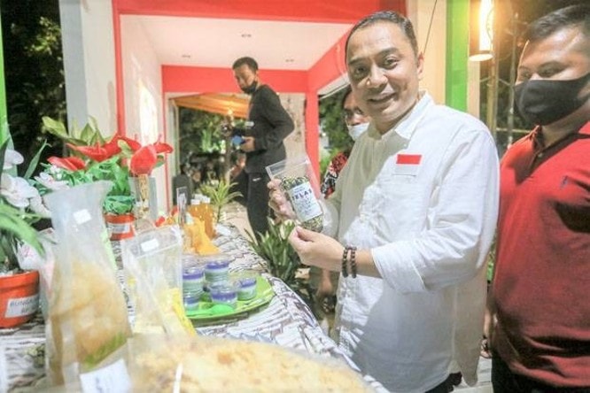 Wali Kota Surabaya Eri Cahyadi menunjukkan display UMKM. Dok. JawaPos