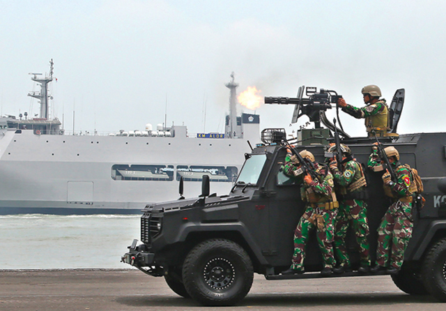 GERAK CEPAT: Pasukan Kopaska berlatih membebaskan sandera dengan menaiki rantis dan membawa senjata. (Ahmad Khusaini/Jawa Pos)