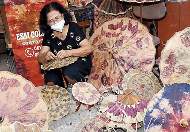 Payung yang dibuat bukan payung biasa. Tapi, payung berbahan dasar kertas semen bekas yang diolah menjadi ornamen bernilai tinggi, berpadu dengan daun jati. ’’Iya, konsep ini disebut juga eco-printing. Biasanya di kain ini, di kertas semen bekas,’’ ungkapnya.