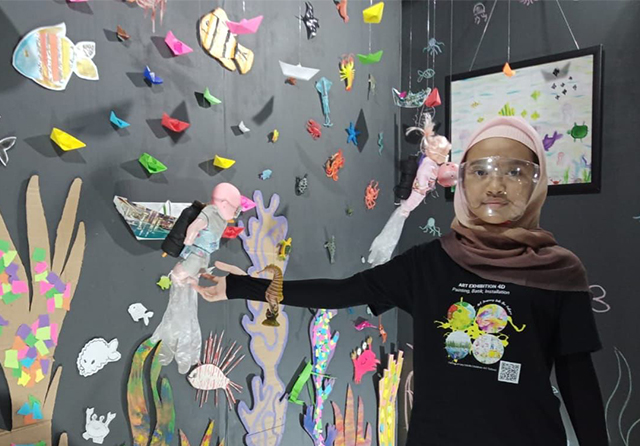 Salah satu di antaranya karya Dhafira Khairuna Arifin. Selain sejumlah lukisan, bocah 9 tahun itu juga memamerkan karya seni instalasi dengan judul Laut Palsu.
