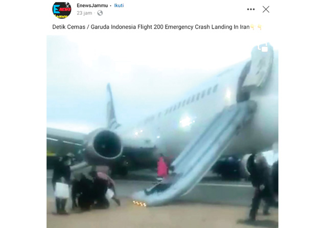 KABAR palsu yang satu ini cukup menggelitik. Armada milik Garuda Indonesia diberitakan mendarat darurat di Iran. ’’Detik Cemas/Garuda Indonesia Flight 200 Emergency Crash Landing in Iran.’’ Demikian bunyi keterangan di akun Facebook EnewsJammu Senin (10/1) lalu (bit.ly/LakaGarudaIndonesia).