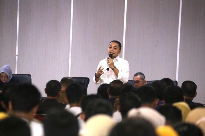 JawaPos.com–Wali Kota Surabaya Eri Cahyadi kumpulkan staf perizinan di seluruh lingkungan Pemerintah Kota (Pemkot) Surabaya, di Convention Hall Siola. Bukan hanya staf, Wali Kota Eri Cahyadi juga mengumpulkan jajaran sekretaris daerah (sekda), asisten, dan kepala perangkat daerah (PD).