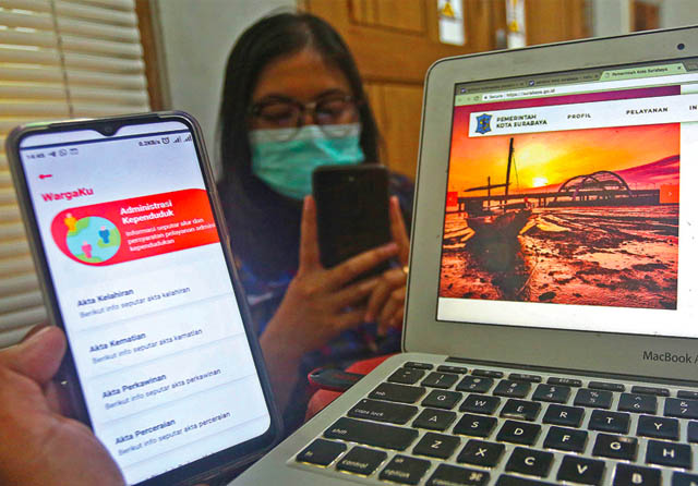 PELAJARI SISTEM BARU: Warga mencari informasi pelayanan publik melalui aplikasi Wargaku (11/2). Aplikasi itu dibuat untuk mempermudah warga mengajukan layanan ke Pemerintah Kota Surabaya. (Ahmad Khusaini/Jawa Pos)