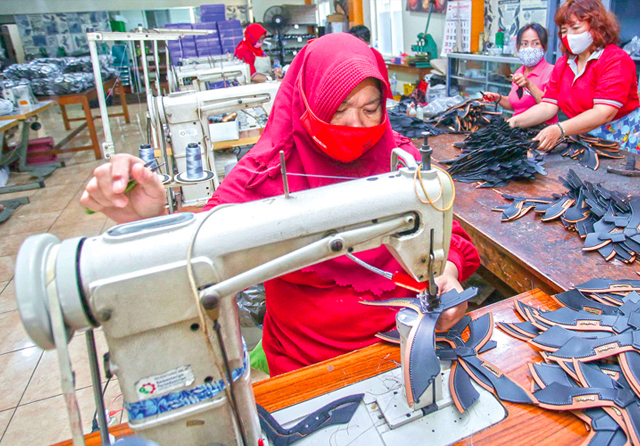 BISA LEBIH TENANG: Pekerja pabtik sepatu menuntaskan pekerjaan. Mereka yang kehilangan pekerjaan selama terdaftar sebagai peserta BPJAMSOSTEK bisa mencairkan JKP. (Alfian Rizal/Jawa Pos)