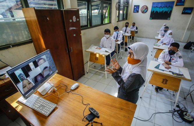 Penerapan pembelajaran hybrid di salah satu SMP di Surabaya. Dipta Wahyu/JawaPos