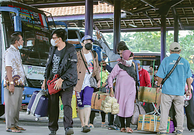 ARUS BALIK: Penumpang turun dari bus di area kedatangan Terminal Purabaya, Kamis (5/5). Pemkot Surabaya segera melakukan operasi yustisi di berbagai wilayah. (Alfian Rizal/Jawa Pos)