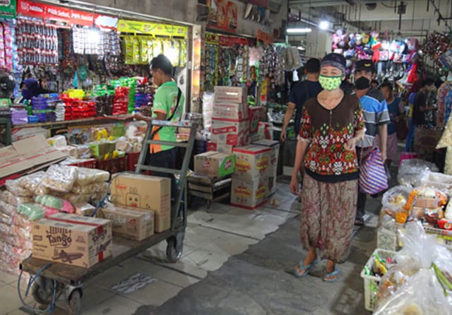 TERPUKUL: Aktivitas perdagangan di Pasar Tambahrejo. Para pedagang meminta keringanan pembayaran ILP karena pendapatan mereka merosot drastis di kala pandemi. (Frizal/Jawa Pos)