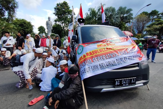 Massa itu datang dari berbagai wilayah di Jawa Timur. Sekelompok massa yang berorasi di depan Taman Apsari Surabaya membawa banner bertuliskan Aliansi Lamongan. Tak jauh, ada juga sekelompok orang dengan mengusung nama Jamaah Ansharu Syariah.