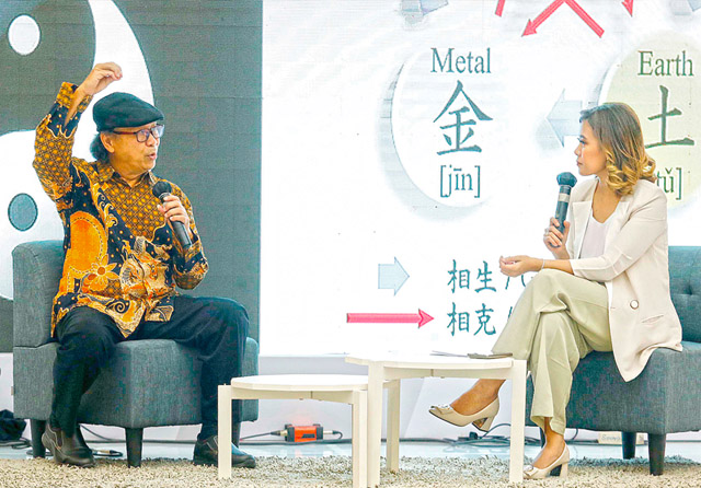 BERI PAPARAN: Mauro Rahardjo dalam talk show Apa Itu Fengsui pada acara Mandiri Jawa Pos Property Week 2022 di Ciputra Wordl Surabaya, Jumat (29/7). Mauro mengenalkan lima elemen dalam hidup yang perlu dilengkapi saat menempati hunian. (Puguh Sujiatmiko/J