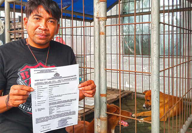 PRIHATIN: Kristian Adi Wibowo menunjukkan bukti laporan polisi dan anjing yang bisa diselamatkan. (Eddi Sudrajat/Jawa Pos)