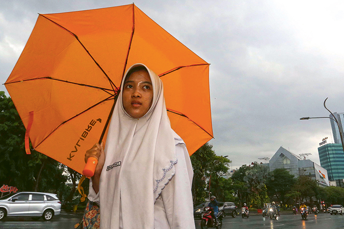 BERLINDUNG DARI HUJAN: Jihan Lutfia, seorang pelajar, memakai payung saat melintas di Jalan Gubernur Suryo kemarin (22/1). BMKG memprakirakan cuaca buruk menerjang Surabaya sepekan ke depan.
