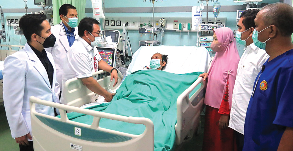 KASUS LANGKA: Dari kiri, dr Danang Himawan Limanto SpBTKV MKed Klin, dr Joni Wahyuhadi SpBS(K), Prof Dr dr Med Puruhito SpB(K)TKV, dan Dr Yan Efrata Sembiring dr SpB SpBTKV(K) (dua dari kanan) saat mengunjungi Agus Sukawanendra di ruang ICU gedung Pusat P
