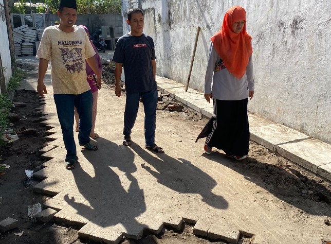 Ketua RT 01 Simo Pomahan Baru Gang 1, Pursito menuturkan, udah satu bulan sejak pengerjaan dilakukan belum juga selesai. Hanya terlihat dua tukang yang ada di lokasi.