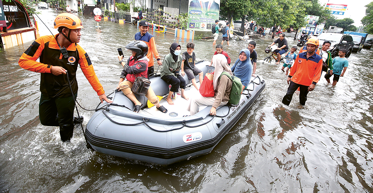 JALAN DAN PERUMAHAN TERGENANG: Tim BPBD Jawa Timur mengevakuasi warga terdampak banjir di Pepelegi, Waru, Sidoarjo, kemarin (7/2).
