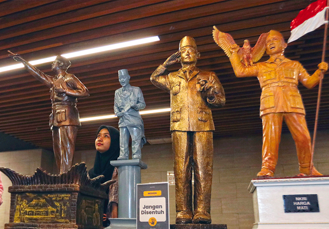 MINIATUR: Pengunjung Balai Pemuda Nur Widya melihat patung Bung Karno di ruang pameran, Rabu (2/11). Pemkot bakal membangun patung Bung Karno di perempatan MERR dan Jalan Kertajaya Indah. (Frizal/Jawa Pos)