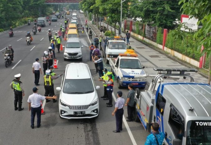 Pemeriksaan kendaraan bermotor di Jalan Ahmad Yani, kawasan Bunderan Waru atau perbatasaan Kota Surabaya dan Kabupaten Sidoarjo sebagai upaya pencegahan penyebaran Covid-19. Humas Pemkot Surabaya/Antara