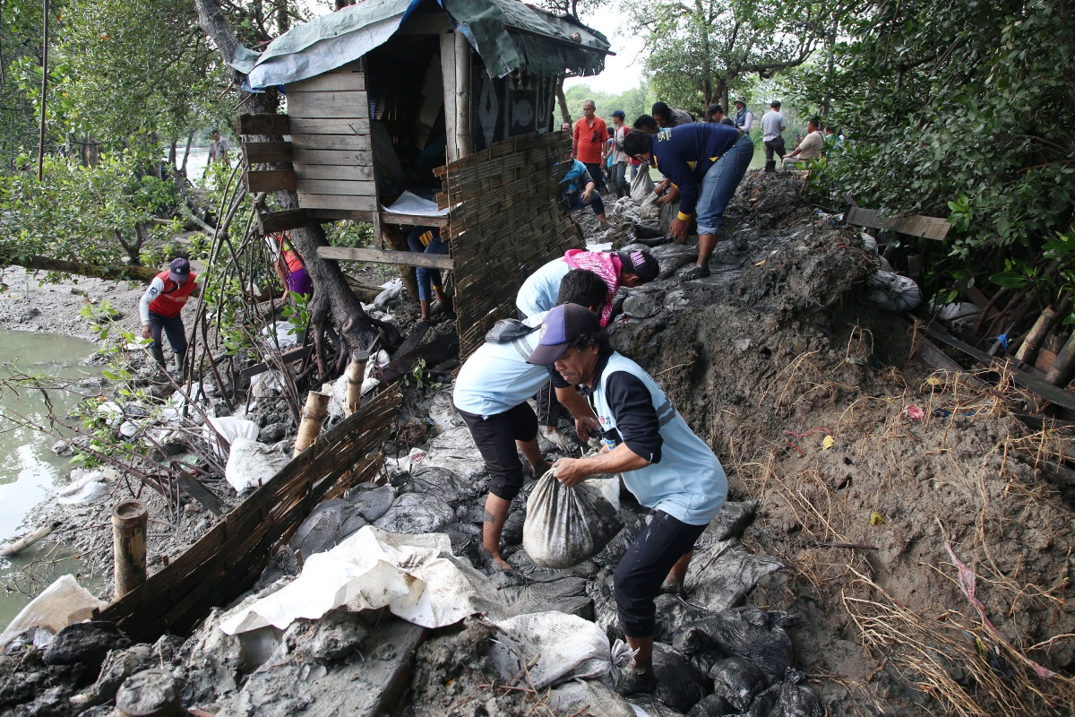 Wali Kota Surabaya Eri Cahyadi bersama warga Greges Timur gotong royong memperbaiki tanggul yang jebol akibat banjir rob. (Humas Pemkot Surabaya)