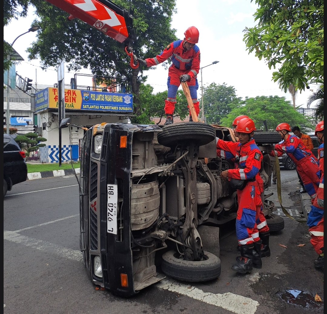 Petugas damkar saat lakukan evakuasi mobil boks bermuatan plastik terguling di Sawahan, Surabaya. (DPKP Kota Surabaya)