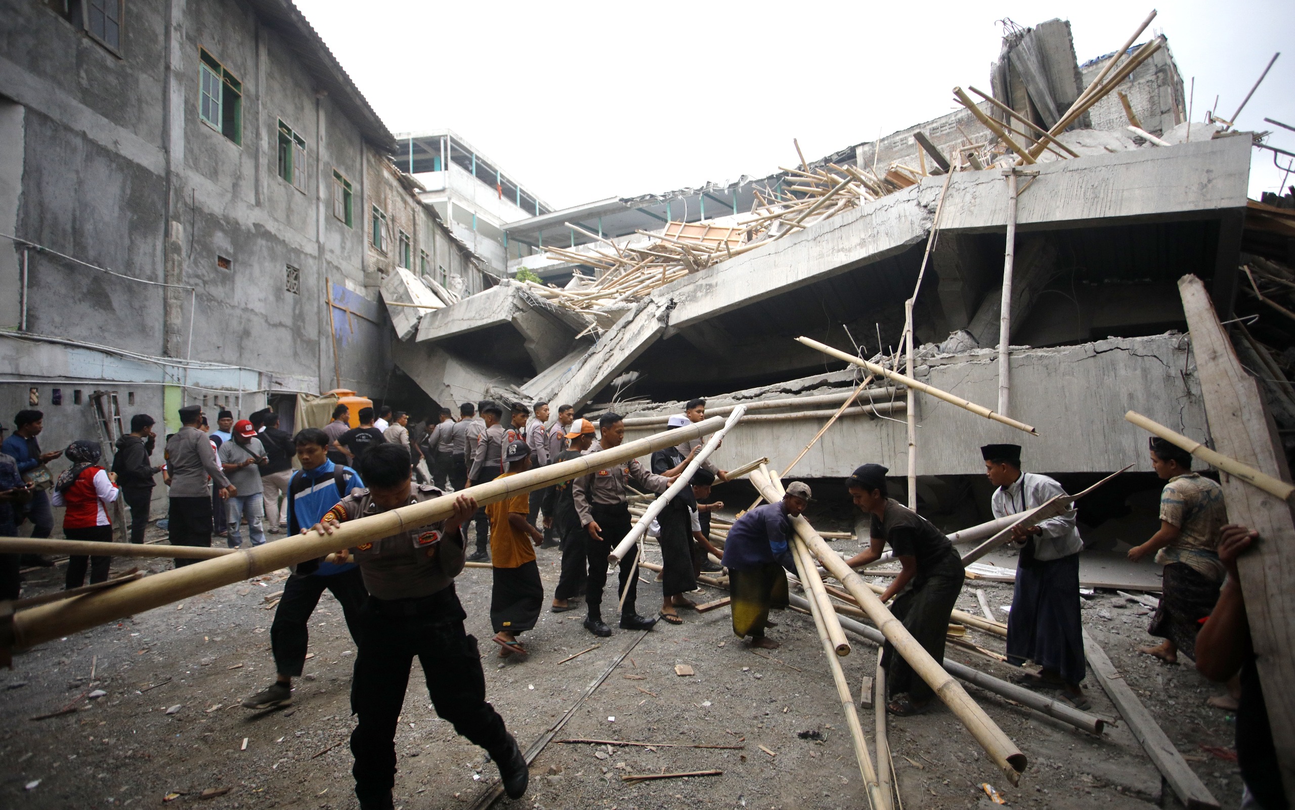 Sontak, puing-puing bangunan Musala menimpa para santri. Banyak santri yang terjebak di balik reruntuhan. Hal ini membuat tim SAR gabungan sangat berhati-hati dalam mengevakuasi dan mengambil puing-puing bangunan.