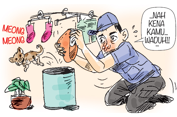 Tinggal satu lagi yang posisinya terpojok di bawah jemuran. Saat lengah, happp… petugas melompat menangkap kucing. ”Ternyata salah. Yang ditangkap justru pakaian dalam,” tutur Riki, lantas tertawa.