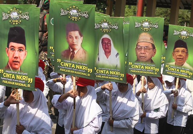 INGAT SEJARAH: Ribuan santri Kota Delta membawa poster kiai dan pahlawan nasional dari Nahdlatul Ulama dalam pawai peringatan HSN, Minggu (20/10). (Boy Slamet/Jawa Pos)