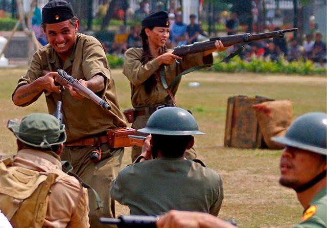MERDEKA: Christa Soeters (kiri) dan Michael van Zeijl berperan sebagai pejuang dalam teaterikal di lapangan Tugu Pahlawan, Minggu (27/10). (Ahmad Khusaini/Jawa Pos)