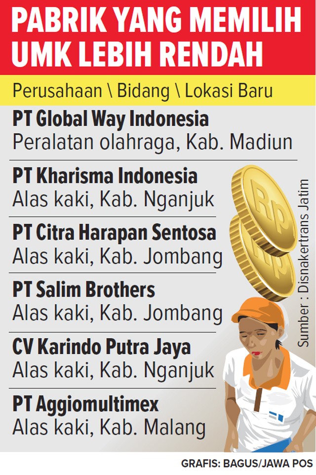 Anas menambahkan, relokasi pabrik ke kawasan dengan UMK yang lebih rendah bukan hanya Jatim. Pemprov Jabar mengeluh serupa. Untuk mencegahnya, dia menyampaikan ada mekanisme penangguhan bagi perusahaan yang tidak mampu membayar UMK. ’’Kalau dirasa tidak bisa, ada dasar hukum untuk melakukan penangguhan,’’ katanya.