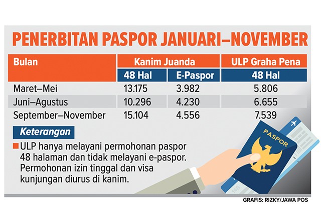 JawaPos.com – Euforia libur Natal dan tahun baru (Nataru) terasa. Salah satunya terlihat dari pemohon paspor di Kantor Imigrasi (Kanim) Kelas I Khusus TPI Surabaya dan Unit Layanan Paspor (ULP) Graha Pena. Sejak akhir November hingga saat ini, mayoritas pemohon paspor didominasi warga yang akan menghabiskan libur dan cuti panjang ke luar negeri.