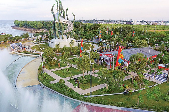 IKON BARU KOTA: Patung Suroboyo setinggi 25 meter ini diresmikan Wali Kota Tri Rismaharini kemarin sore (29/5). (Robertus Risky/Jawa Pos)